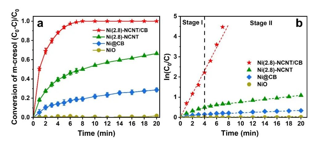 图2 多种Ni基催化剂通过PMS氧化反应降解间甲酚曲线(a)及相应的一级动力学曲线(b)