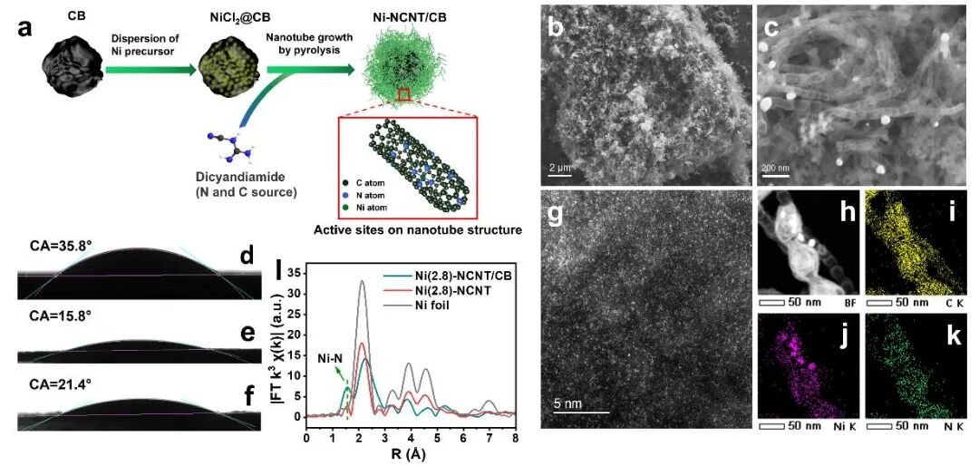图1 (a)催化剂Ni-NCNT/CB的合成路线图解;(b,c)Ni(2.8)-NCNT/CB的SEM图;(d-f)CB(d)、Ni(2.8)-NCNT(e)、Ni(2.8)-NCNT/CB(f)的水接触角;(g-k)HAADF-STEM图(g)以及mapping图(h-k);(l)傅里叶变换EXAFS图谱