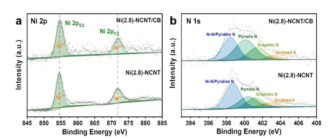 图3 催化剂Ni(2.8)-NCNT/CB和Ni(2.8)-NCNT的Ni 2p(a)和N 1s(b)XPS图