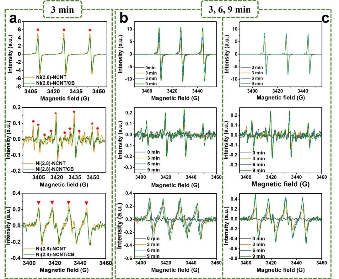 图4 (a)3 min时PMS活化体系中1O2 (●)、•OH (★)、SO4•- (◆)和•O2- (▼)EPR谱图;不同时间PMS活化体系Ni(2.8)-NCNT/CB (b)和Ni(2.8)-NCNT(c)的1O2 (●)、•OH (★)、SO4•- (◆)和•O2- (▼)EPR谱图