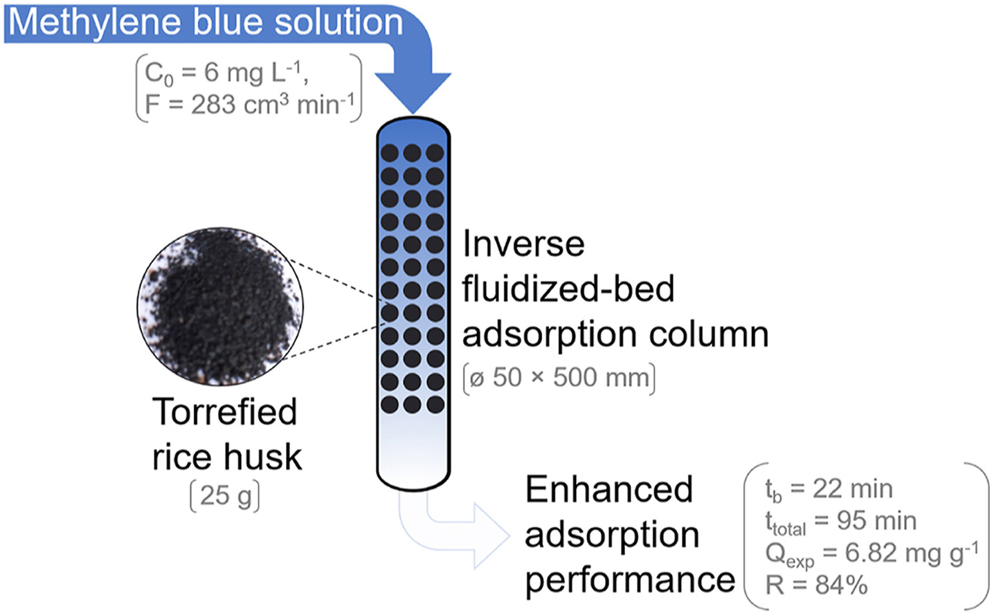 ABSTRACT: In this work, the inverse fluidized-bed bio-adsorption column is applied for the first time and is demonstrated using the torrefied rice husk (TRH) for the removal of methylene blue from the solution. The bio-adsorbents were characterized by BET, FI-IR, and SEM. The inverse fluidized-bed adsorption column using TRH becomes saturated in the 95-min continuous adsorption, during which the breakthrough time is 22 min, the overall MB removal (R) is 84%, and the adsorption capacity (Qexp) on the TRH is 6.82 mg g−1. These adsorption characteristics are superior to those in the fixed-bed adsorption column (R of 52% and Qexp of 2.76 mg g−1) at a lower flow rate (100 vs. 283 cm3 min−1). Torrefaction of RH significantly increases the surface area (28 vs. 9 m2 g−1) and enhances the surface functional groups, leading to an improved maximum equilibrium adsorption amount from 21.5 to 38.0 mg g−1 according to Langmuir model in the batch adsorption system. Besides, the increased Qexp on the TRH is also obtained in the inverse fluidized-bed (5.25 vs. 2.77 mg g−1, 89% higher) and the fixed-bed (2.76 vs. 1.53 mg g−1, 80% higher) adsorption columns compared to that on the RH.