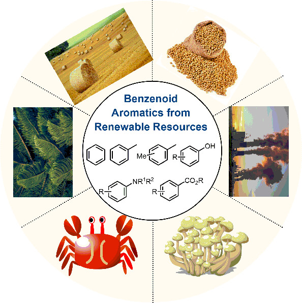 ABSTRACT: In this Review, all known chemical methods for the conversion of renewable resources into benzenoid aromatics are summarized. The raw materials that were taken into consideration are CO2; lignocellulose and its constituents cellulose, hemicellulose, and lignin; carbohydrates, mostly glucose, fructose, and xylose; chitin; fats and oils; terpenes; and materials that are easily obtained via fermentation, such as biogas, bioethanol, acetone, and many more. There are roughly two directions. One much used method is catalytic fast pyrolysis carried out at high temperatures (between 300 and 700 °C depending on the raw material), which leads to the formation of biochar; gases, such as CO, CO2, H2, and CH4; and an oil which is a mixture of hydrocarbons, mostly aromatics. The carbon selectivities of this method can be reasonably high when defined small molecules such as methanol or hexane are used but are rather low when highly oxygenated compounds such as lignocellulose are used. The other direction is largely based on the multistep conversion of platform chemicals obtained from lignocellulose, cellulose, or sugars and a limited number of fats and terpenes. Much research has focused on furan compounds such as furfural, 5-hydroxymethylfurfural, and 5-chloromethylfurfural. The conversion of lignocellulose to xylene via 5-chloromethylfurfural and dimethylfuran has led to the construction of two large-scale plants, one of which has been operational since 2023.
