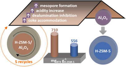 摘要:为研究Al₂O₃粘结剂对催化剂性能的影响,本文在连续固定床反应器中考察了甘油在成型H-ZSM-5/Al2O3(60/40 wt%)催化剂上催化转化为芳烃(GTA,如苯、甲苯和二甲苯,即BTX)的反应过程。实验在N₂氛围、550 °C、甘油空速(WHSV)为1 h⁻¹及常压条件下进行。对使用后的H-ZSM-5/Al2O3催化剂在680 °C进行氧化再生,并完成总计5次反应-再生循环。表征结果表明,Al2O3粘结剂的添加不影响催化剂体系的比表面积和结晶度,但显著增加了总孔体积(尤其是介孔)和总酸量(以路易斯酸为主)。与纯H-ZSM-5相比,H-ZSM-5/Al₂O₃(60/40 wt%)催化剂的寿命明显延长(8.5 h vs. 6.5 h),BTX总产率显著提高(710 vs. 556 mg/g H-ZSM-5)。此外,Al₂O₃粘结剂的引入延缓了催化剂的不可逆失活:经历3次再生后,催化剂性能仍与新鲜催化剂相当;但经过4次再生后,由于总孔体积、结晶度、酸量(尤其是布朗斯特酸)以及Al2O3粘结剂介孔结构的减少,出现部分不可逆失活。本研究证明,使用合适的粘结剂可显著提升H-ZSM-5基催化剂在GTA反应中的稳定性和可重复使用性。