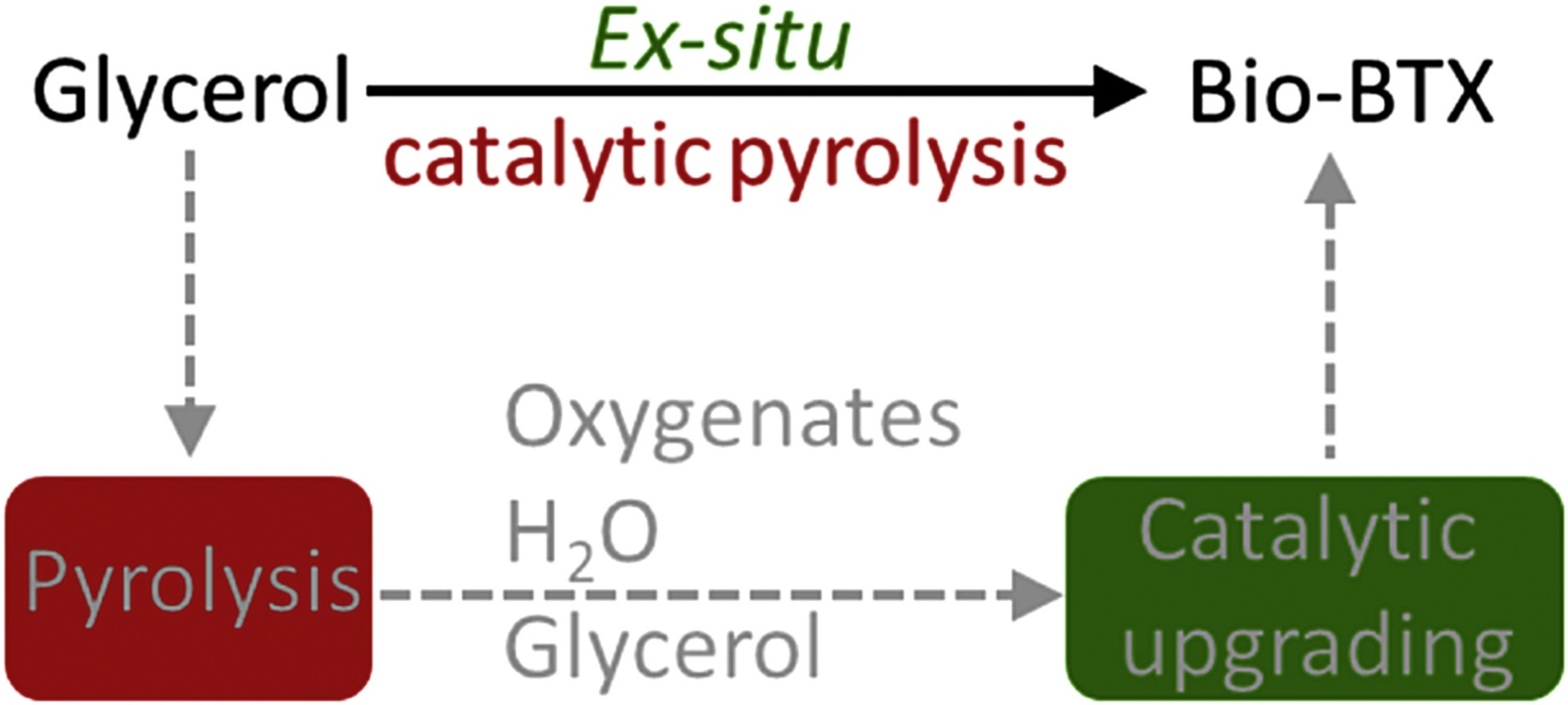 摘要:本研究采用非原位催化热解策略,在未改性H-ZSM-5(SiO₂/Al₂O₃摩尔比为23)催化剂上,通过规模为1克甘油/小时的连续串联微反应器,实现了纯甘油向生物芳烃(苯、甲苯和二甲苯,即bio-BTX)的催化转化。在热解温度400 °C、催化升级温度500 °C、常压及重量空速1 h⁻¹的条件下,BTX峰值碳收率达到28.1 ± 0.2%。甘油中约70%的结合氧被转化为水,其中水主要生成于催化升级单元(占总水生成量的70%),但热解单元中亦观察到甘油转化为其他含氧化合物并伴随水的生成。催化剂失活发生于小时级别的时间尺度,主要原因为表面积碳(12.0 wt.%)。通过氧化再生去除积碳,成功完成5次反应-再生循环,但每循环后均因不可逆失活导致活性下降。对新鲜、失活及再生催化剂的表征表明,H-ZSM-5骨架发生脱铝,致使布朗斯特酸度急剧降低;脱铝主要发生于催化升级反应器,再生过程中脱铝程度显著较轻。上述结果不仅有助于在分子层面理解过程机制,也为放大研究(如中试装置设计)提供了关键依据。